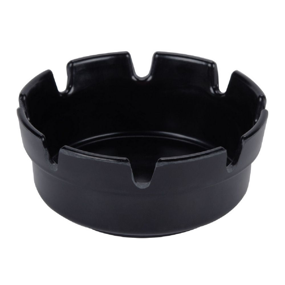 These 4-inch black plastic ashtrays are designed to provide a practical and durable solution for smoking areas within hospitality settings. The deep well design effectively contains ash and cigarette butts, maintaining a clean environment. Constructed from heat-resistant plastic, they are both durable and easy to clean. Each ashtray features multiple cigarette rests, accommodating multiple users simultaneously. The stackable design allows for efficient storage when not in use. Supplied in cases of 72, they are suitable for establishments of all sizes.