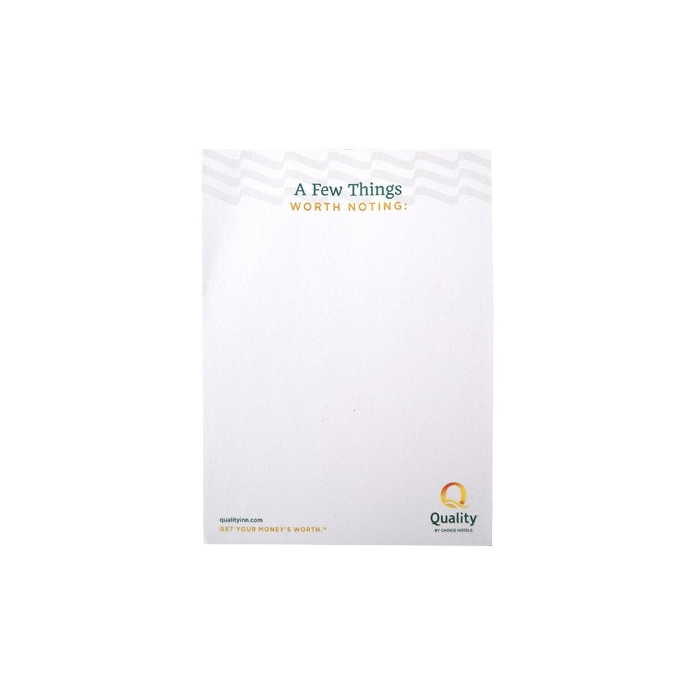The Quality Inn Memo Pads are thoughtfully designed to enhance guest convenience in hotel rooms and common areas. Measuring 4 inches by 6 inches, each pad offers 50 sheets of premium paper with the Quality Inn branding, providing a professional touch to guest rooms. Packaged in cases of 1,000, these notepads ensure that your hotel maintains a consistent supply, reflecting Quality Inn’s commitment to guest service and attention to detail.