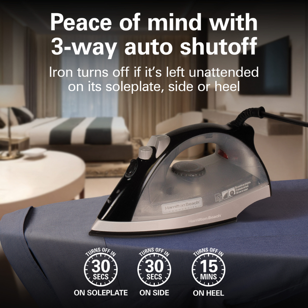 Built-in safety features include a 3-way automatic shutoff that helps prevent accidents when the iron is left unattended. Adjustable steam settings, along with spray, steam blast, and vertical steam functions, provide flexibility for pressing garments, uniforms, and linens. Packaged in a convenient case of four, this model is ideal for hotels, motels, and extended-stay properties looking for a reliable, guest-friendly ironing solution.