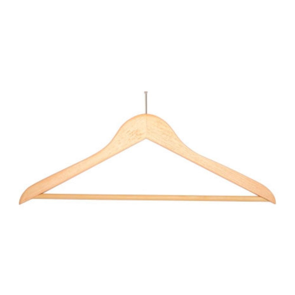 The Men's Hanger in Natural finish with a Ball Top design provides a durable and stylish solution for hanging suits and jackets. Its elegant appearance and sturdy build make it an excellent choice for hotels and retail environments.