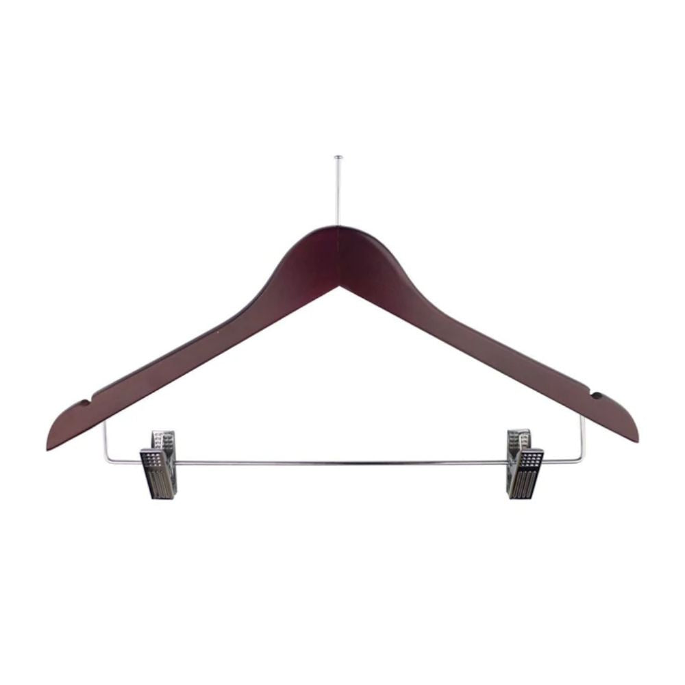 The Women's Hanger in Mahogany features a ball top and flat clips, perfect for hanging skirts, suits, and delicate garments. Its PU coating and chrome hook ensure durability and elegance, making it suitable for hospitality and retail settings.