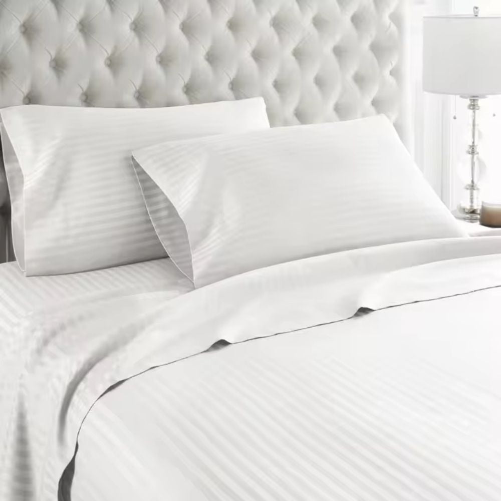 The T-250 Reliance Linen King fitted sheet, sized 72"x84"x14", features an elegant 1cm satin stripe pattern. Crafted from a soft and durable cotton-poly blend, this white fitted sheet is perfect for hotels aiming to provide a high-quality, luxurious bedding experience for guests.