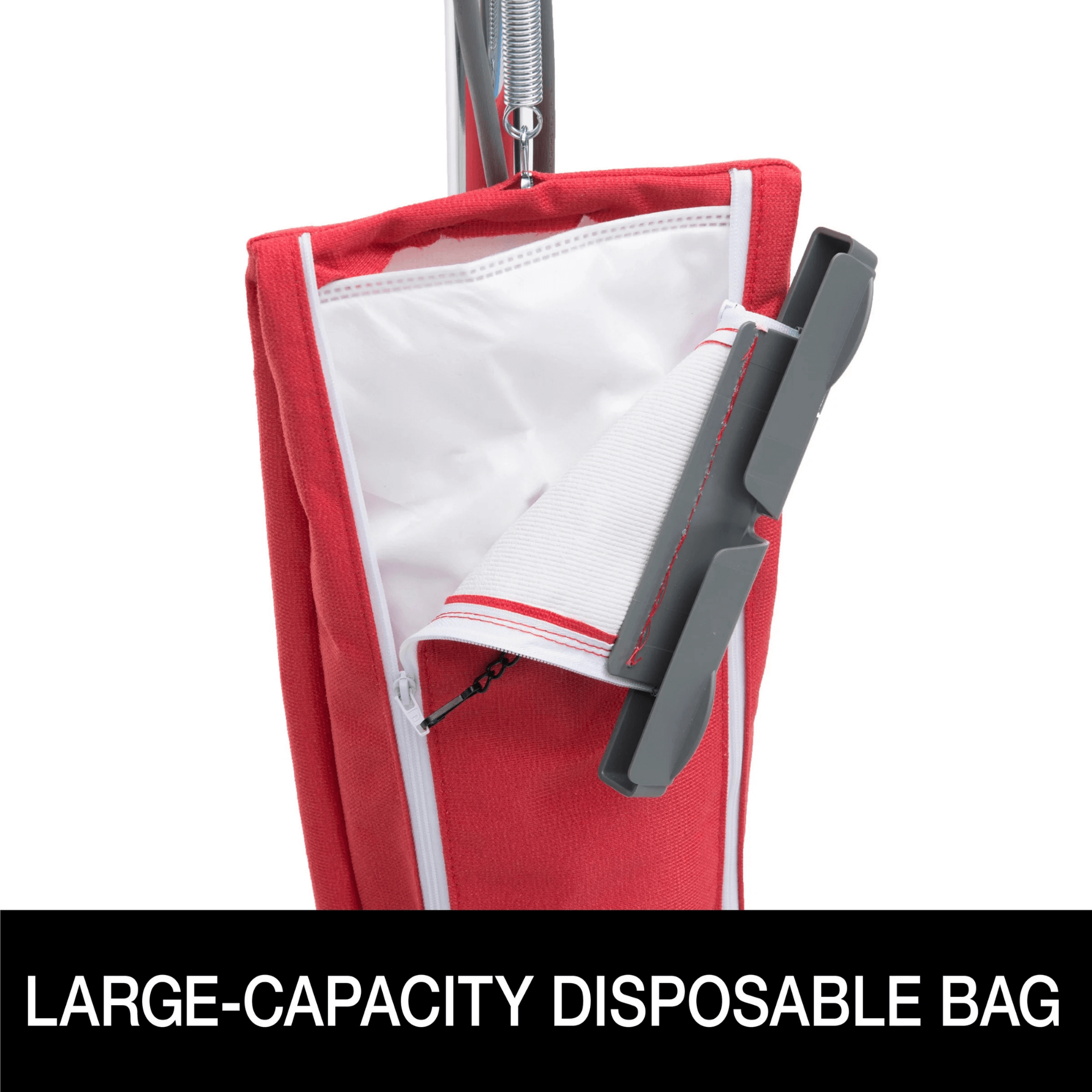 The shake-out bag system offers a cost-effective and eco-friendly dust containment solution, holding a large capacity of debris before needing to be emptied. With a metal brush roll, reinforced base plate, and ball-bearing construction, this vacuum ensures longevity even in demanding environments.