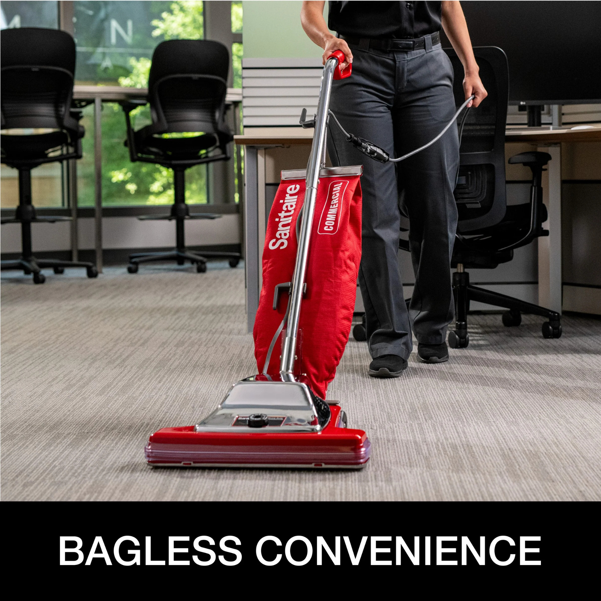 The Sanitaire Tradition SC899H Wide Track® Commercial Upright Vacuum Cleaner is built for high-efficiency cleaning in large spaces, increasing productivity by 33% with its 16-inch cleaning path. Designed for commercial durability, it features a chrome hood and a chrome brush roll with replaceable bristle strips, ensuring long-lasting performance in hotels, offices, and retail environments.